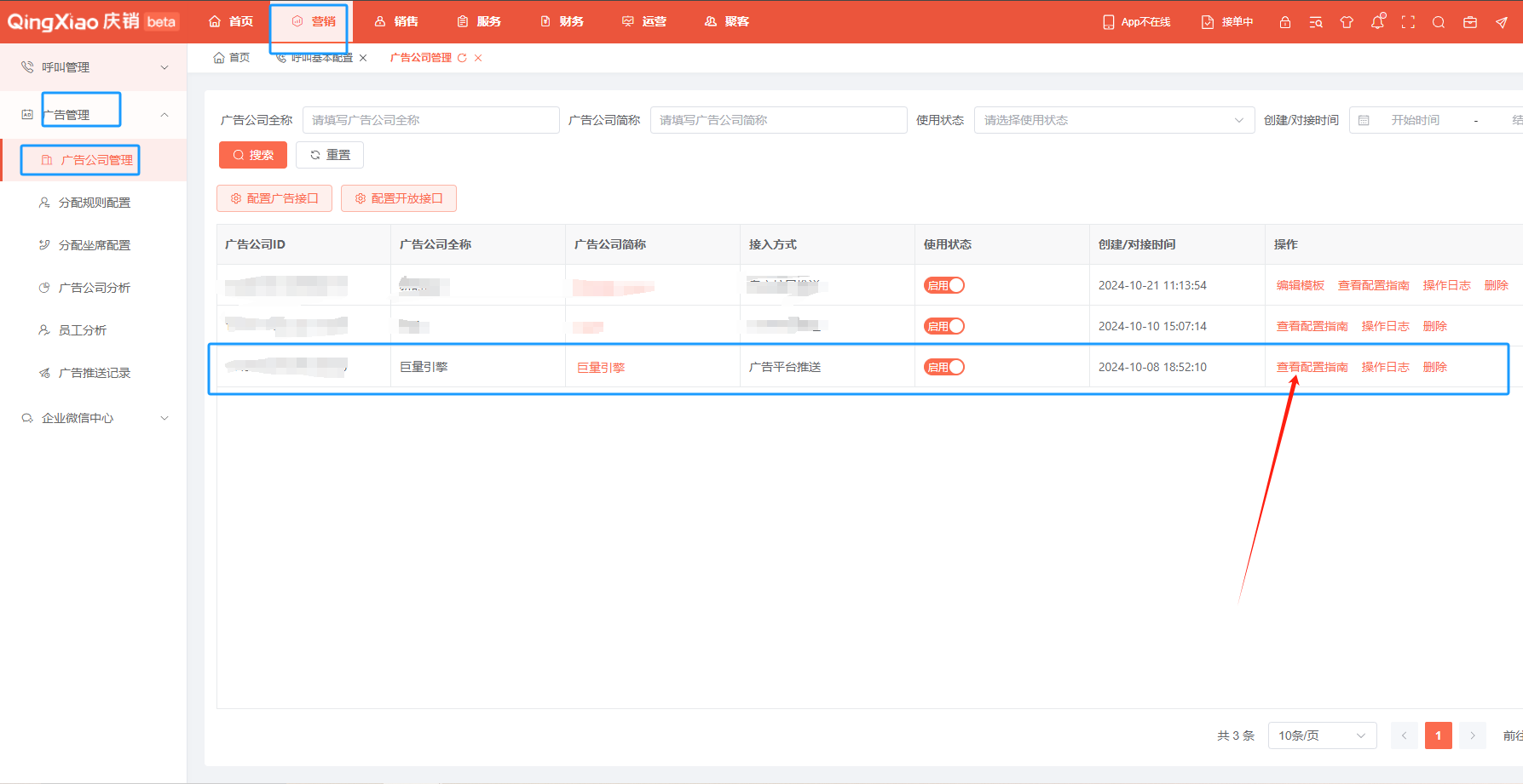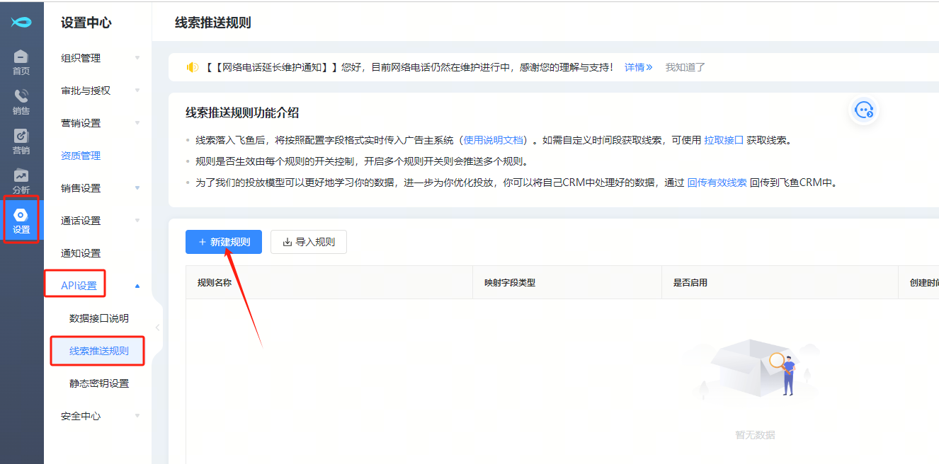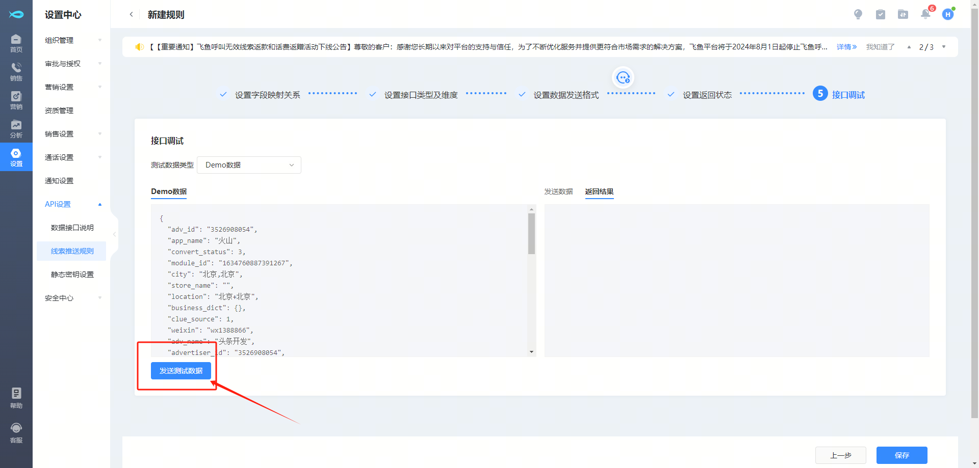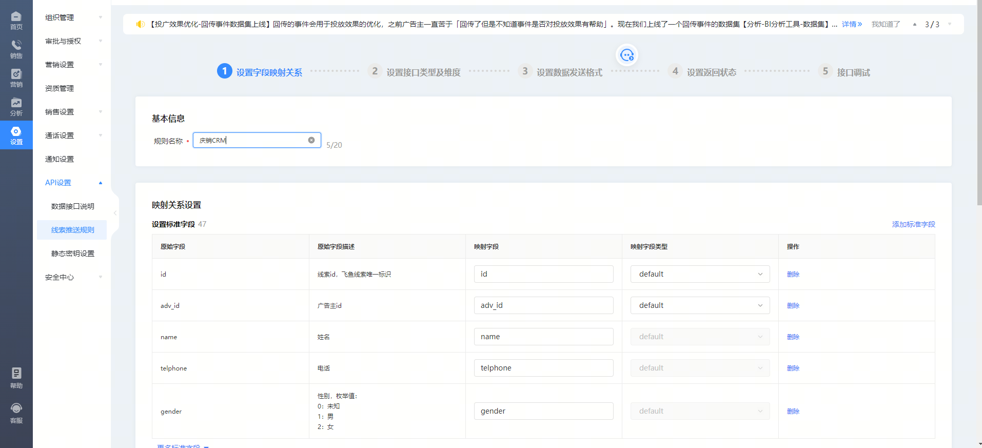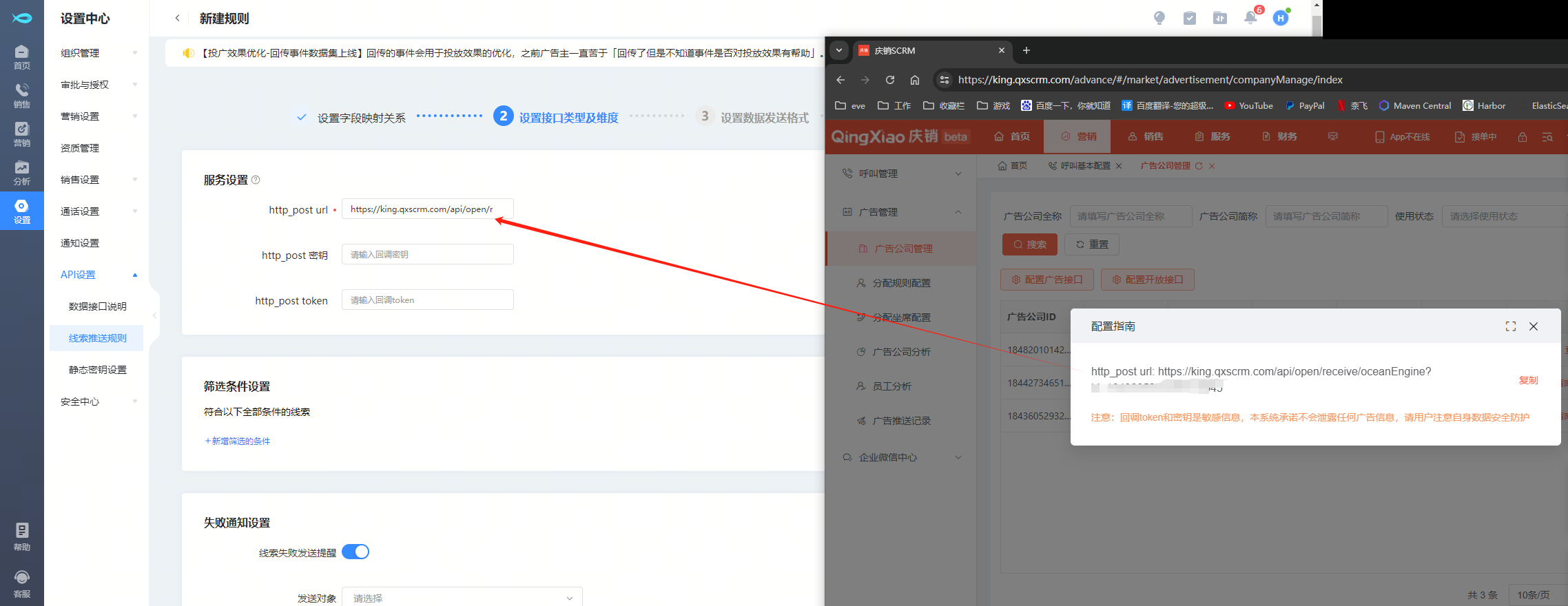 1. 打开飞鱼CRM后台 https://feiyu.oceanengine.com/pc/login 1. 创建规则 1. 登录后打开设置-API设置-线索推送规则 2. 新建规则 3.  4. 填写规则名称 5.  6. 字段映射规则默认即可 7. 点击下一步 8.  9. 在庆销CRM系统-营销-广告管理-广告公司管理找到巨量引擎 10. 点击查看配置指南 11.  12. 复制链接 13.  14. 粘贴到飞鱼 15.  16. 点下一步 17.  18. 点下一步 19.  20. 点下一步 21.  22. 点发送测试数据 23.  24. 显示发送结果如图包含success字样后保存 25.  26. 完成