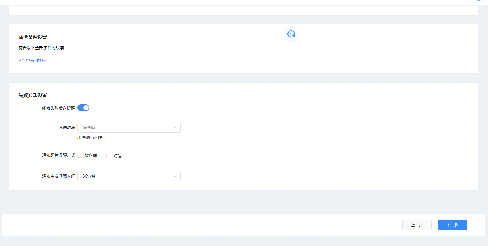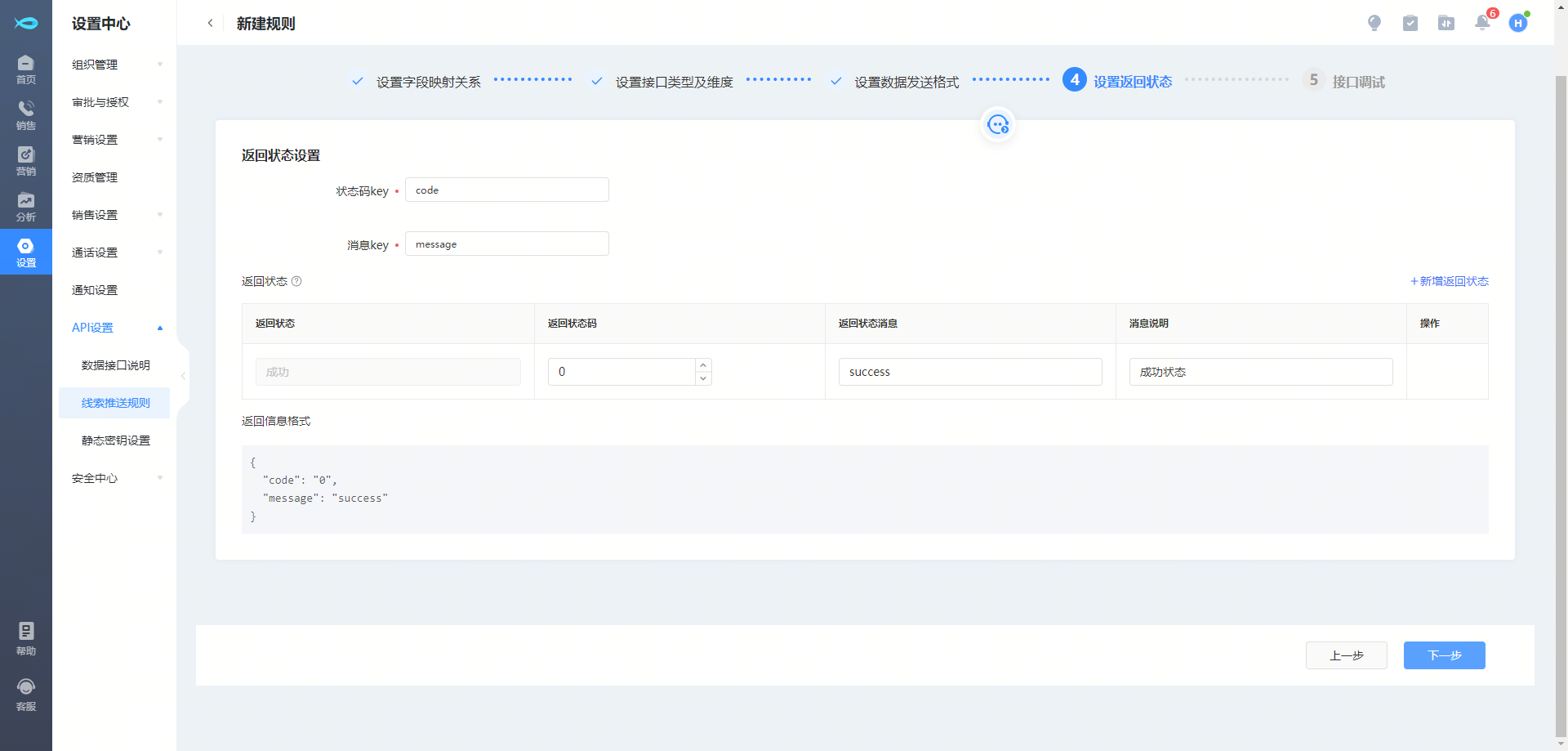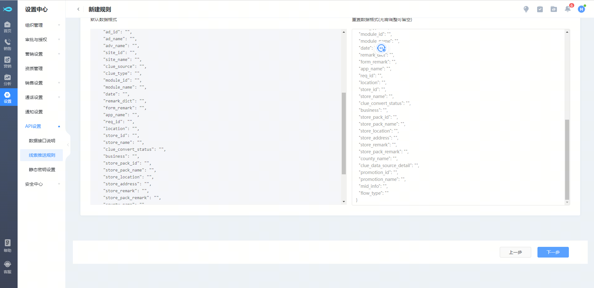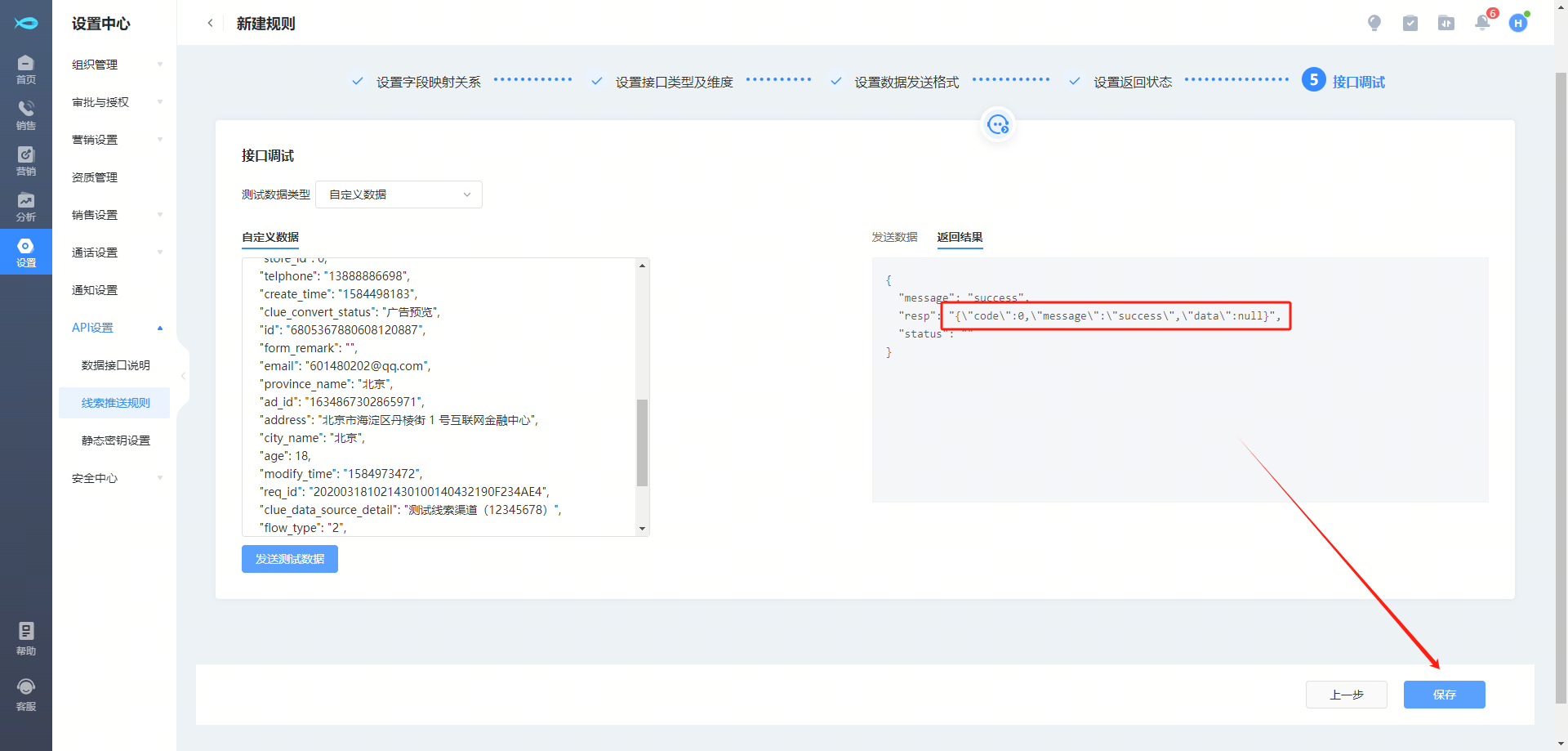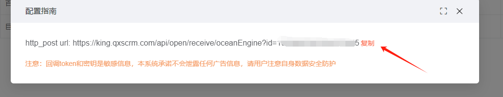 1. 打开飞鱼CRM后台 https://feiyu.oceanengine.com/pc/login 1. 创建规则 1. 登录后打开设置-API设置-线索推送规则 2. 新建规则 3.  4. 填写规则名称 5.  6. 字段映射规则默认即可 7. 点击下一步 8.  9. 在庆销CRM系统-营销-广告管理-广告公司管理找到巨量引擎 10. 点击查看配置指南 11.  12. 复制链接 13.  14. 粘贴到飞鱼 15.  16. 点下一步 17.  18. 点下一步 19.  20. 点下一步 21.  22. 点发送测试数据 23.  24. 显示发送结果如图包含success字样后保存 25.  26. 完成